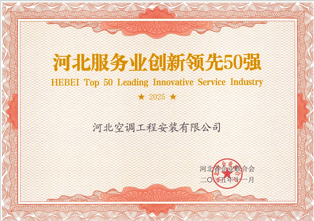 “河北服务业创新领先50强”由省发改委、省科技厅等 11 家单位联合评选,以技术创新、管理创新为核心,通过创新投入、创新成果、创新效益三大量化指标综合考评,是对企业创新能力的权威认可。新众业·河北空调工程公司深耕暖通空调工程安装与节能服务领域,构建了设计研发、生产制造、安装运维全产业链服务体系,拥有河北省中央空调系统安装与运行技术创新中心、省级工程研究中心等多个创新平台,自主研发的“八度空间・健康人居”智能控制系统获国家发明专利,凭借多项核心创新成果赢得客户认可。