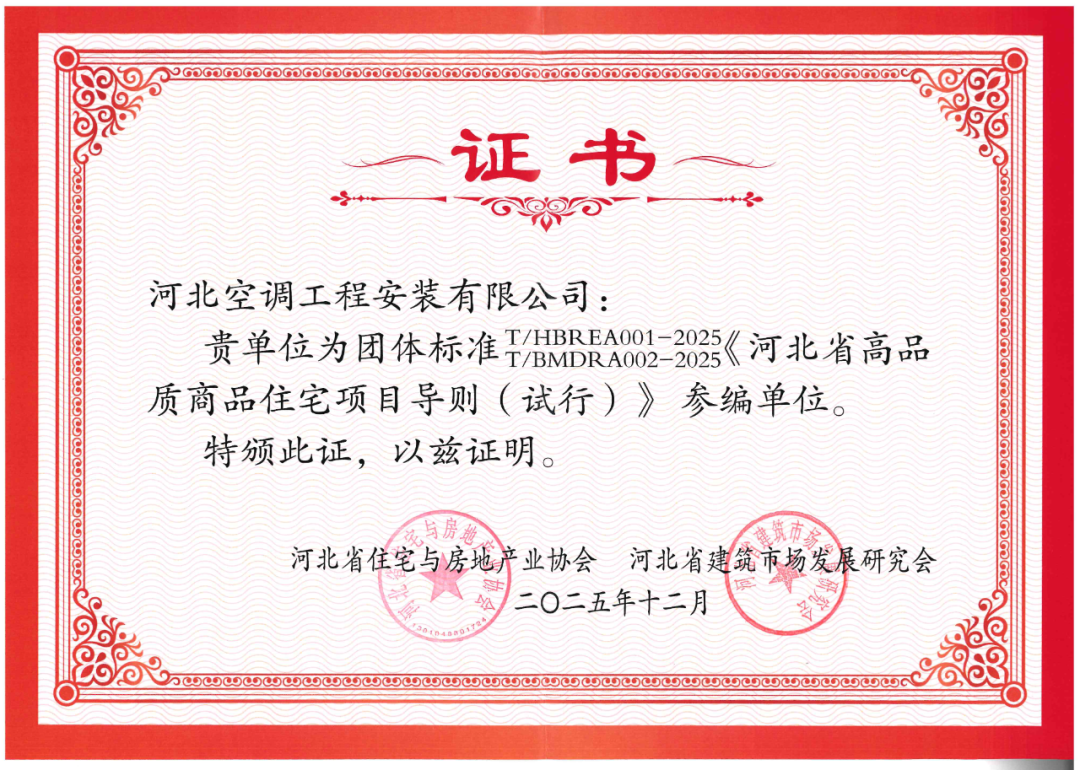 近日,河北省住宅与房地产业协会与河北省建筑市场发展研究会联合发布团体标准T/HBREA001-2025《河北省高品质商品住宅项目导则(试行)》,旨在推动河北省商品住宅建设向更高品质、更可持续方向发展。新众业·河北空调工程安装有限公司作为参编单位,积极参与导则的研讨与制定工作,为提升行业标准化水平贡献了专业力量。