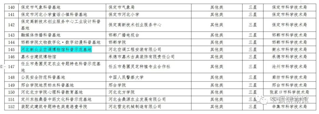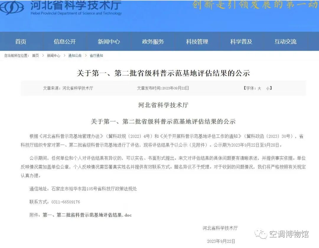 近日,河北省科技厅公布了第一、第二批省级科普示范基地名单,中国空调博物馆(河北省新众业空调博物馆)科普示范基地获评省级“三星”等级。